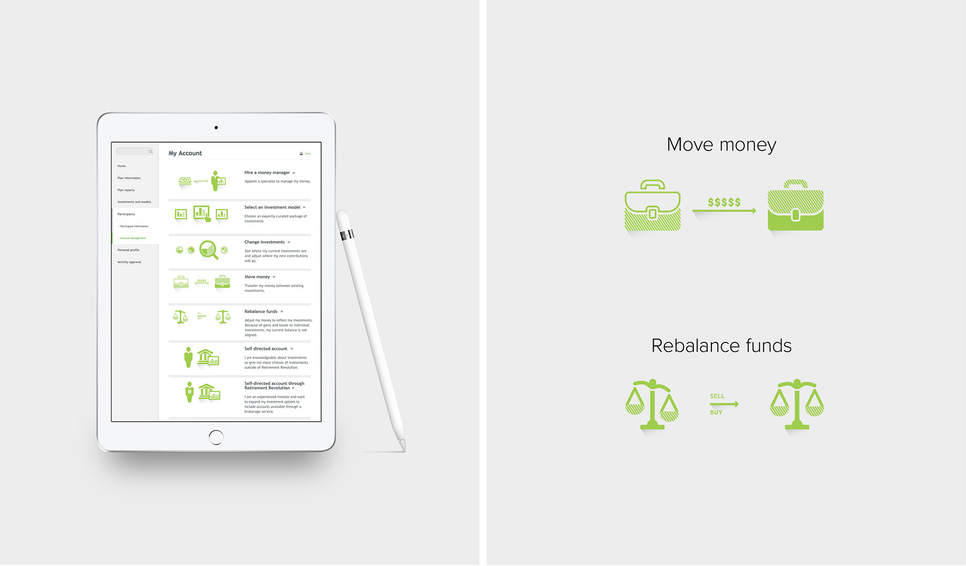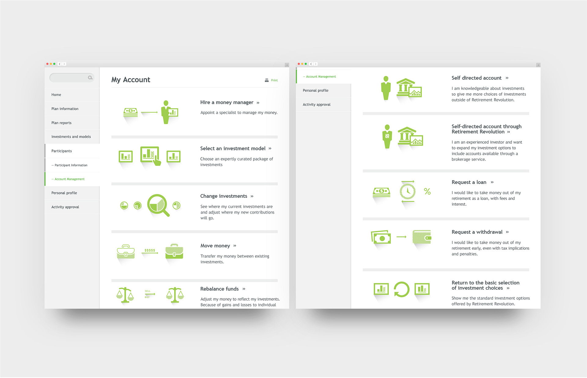 Who is Retirement Revolution. Retirement Revolution combines the best features of trust, brokerage and recordkeeping systems in one relational database that solves for deficiencies in legacy systems. It radically simplifies 401(k) recordkeeping, provides greater operating flexibility and transforms the way forward-thinking organizations manage their retirement business. Their challenge. Retirement Revolution was looking to find a way to make retirement account management simpler. A way to explain all the industry complexities in a clear and straightforward way. Visual solution. (Visual communication). To make it easier for people to understand complex financial concepts, I created visuals that show in a very straightforward way what those terms mean. The solution focuses on showing people what the functionality of speciffic tools is, not just telling them.